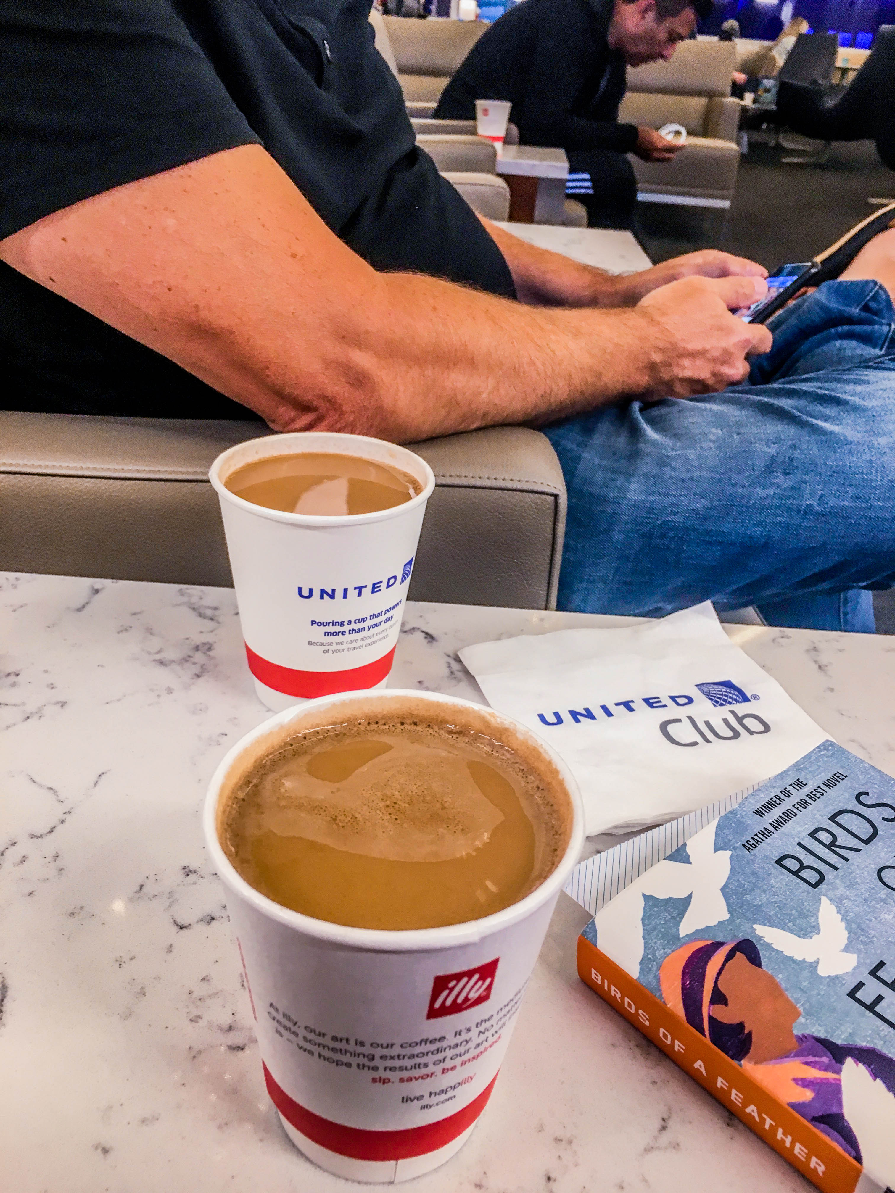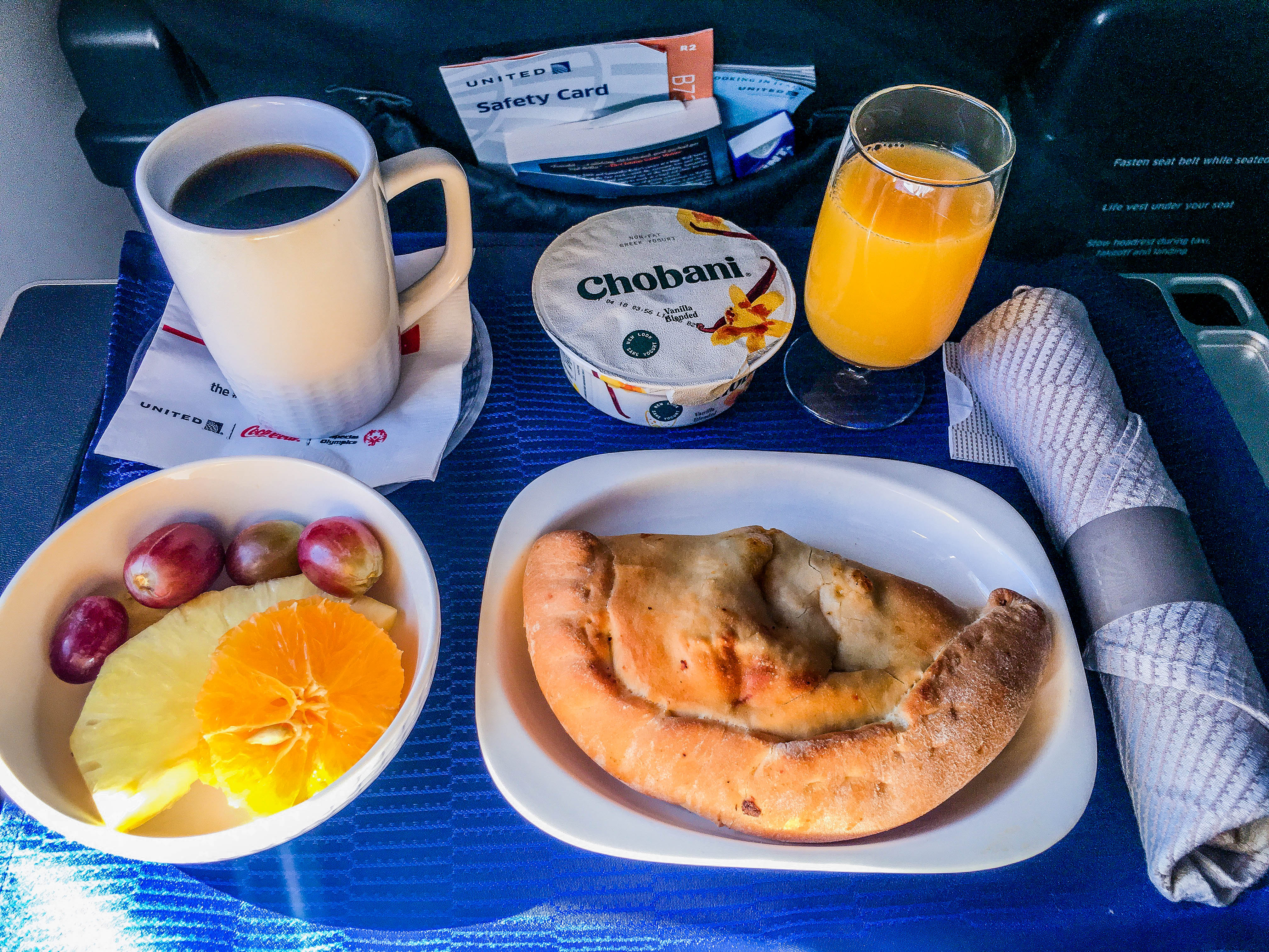 After gliding through security we hit up the United Club lounge for a couple hours. We had hoped for a decent breakfast option up there, but it was extremely unimpressive. Not to worry though because the airplane meal did NOT disappoint. The first big highlight of the trip was breakfast on the plane… (As I type that sentence, I’m starting to wonder though…are we too easily impressed?)