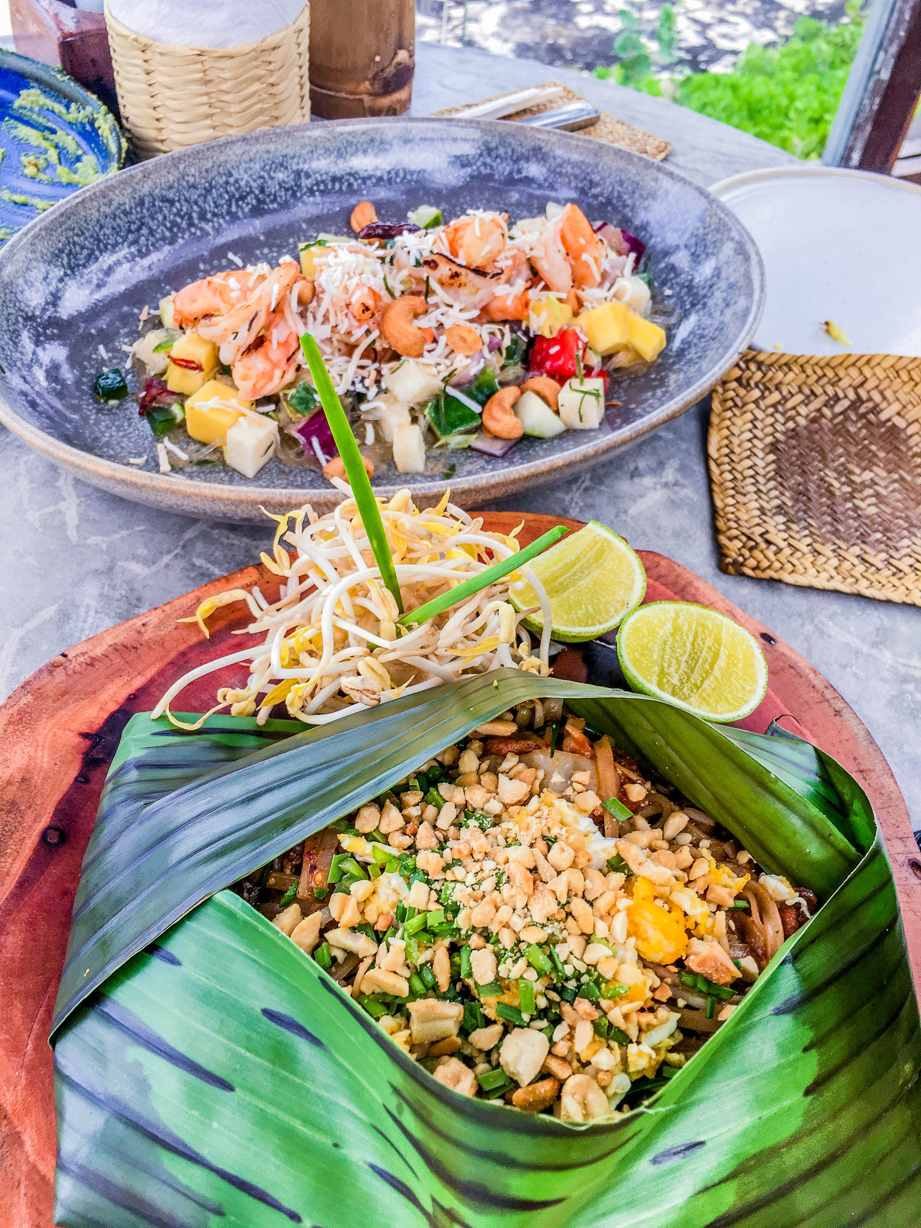 I ordered a coconut shrimp salad – glass noodles, shrimp, fresh veggies, vinegar dressing. This was the star of the evening for us both. Dave ended up eating most of my shrimp salad because it wasn’t too spicy, and he left me with a pretty tasty pad Thai, served in a banana leaf. I ordered it “expatriate hot” which is somewhere between zero spice and face melt… but to be honest, my taste buds were still searing from that habanero pepper. Who really knows if the pad Thai was even hot?