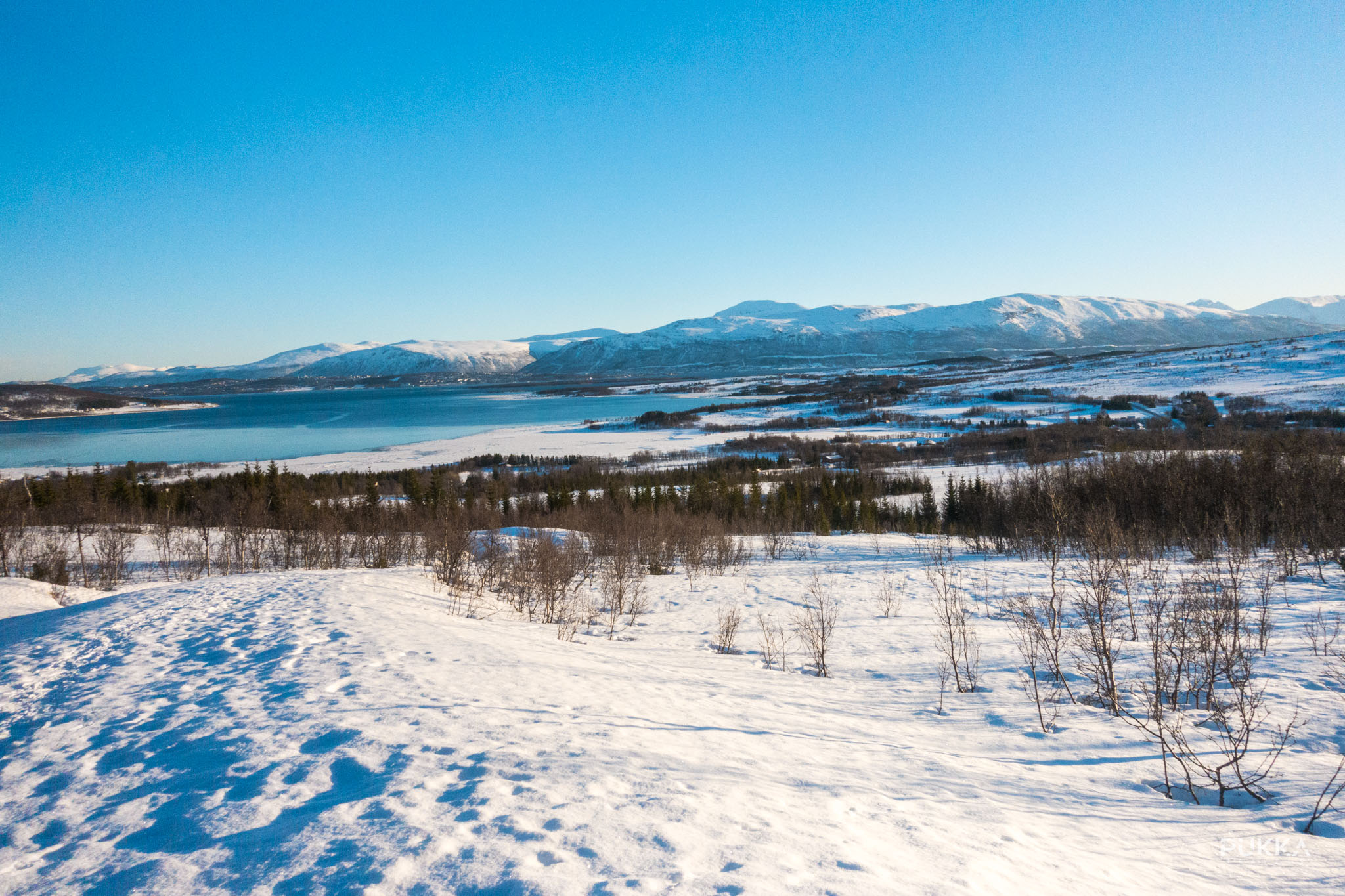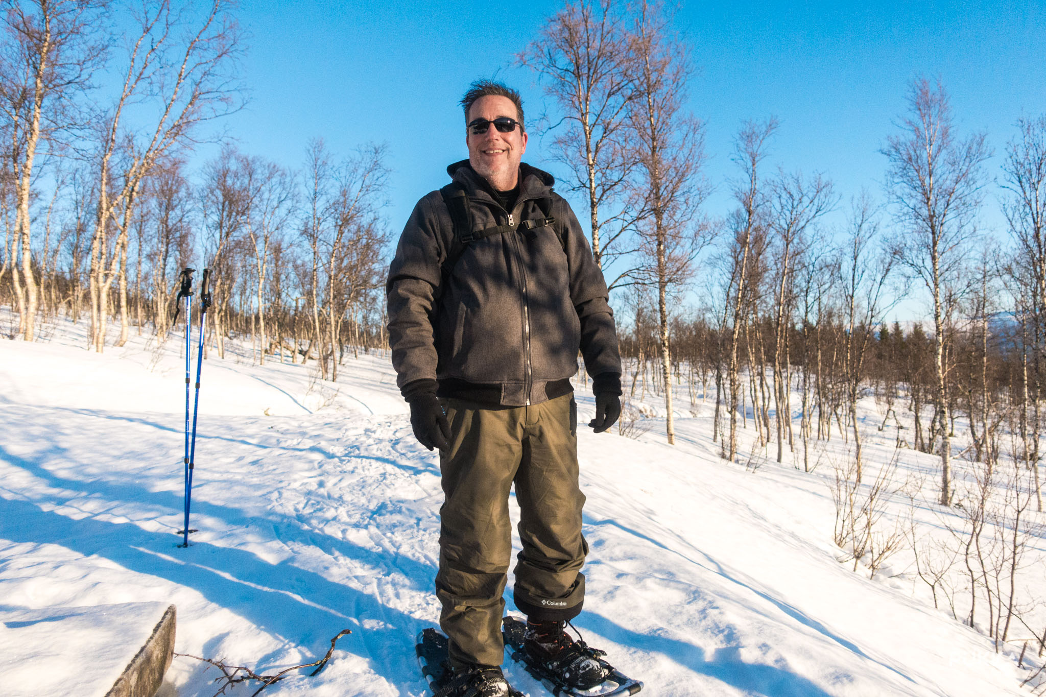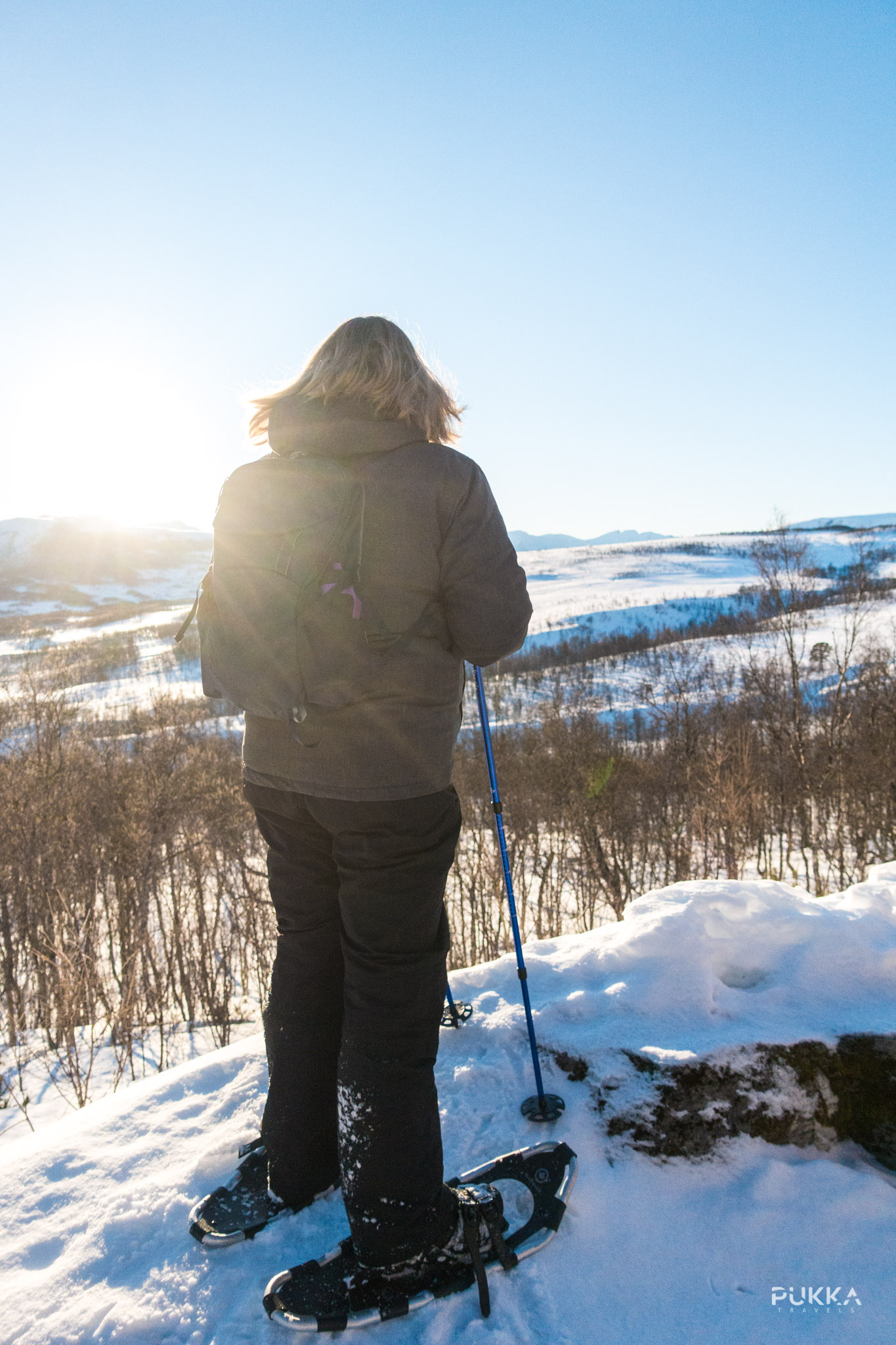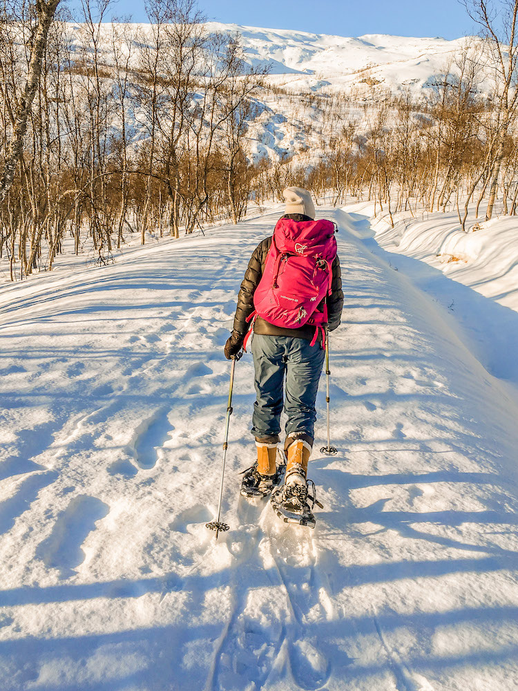 We arrived at Pukka Travels late morning on Valentine’s Day and were introduced to our guide, Nora. She was born and raised in Tromsø, and was therefore an expert tour guide. She packed us each a backpack with lunch, hot cocoa & coffee, and a snack. We were then fitted for the snowshoes and gear and headed out the door – and that’s where we were in for our first surprise!